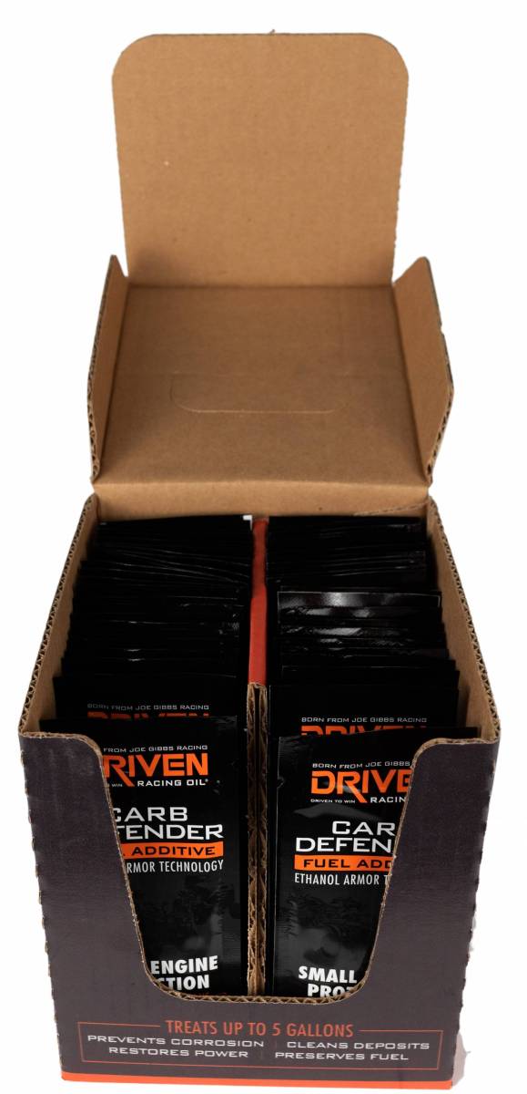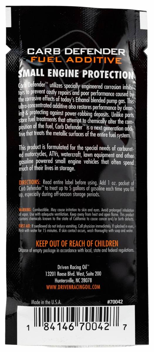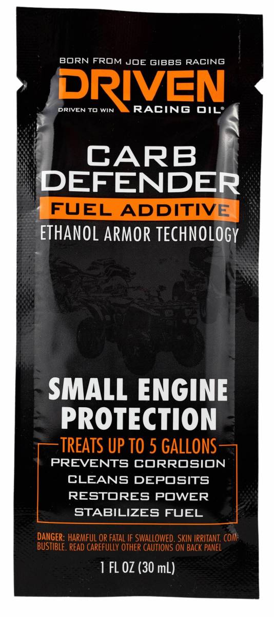 Driven’s Carb Defender® Fuel Additive is specifically formulated to protect against Ethanol corrosion and induction deposits. Special corrosion inhibitors work to prevent expensive repairs and diminished performance caused by Ethanol-blended pump gasoline and the moisture it attracts. This additive controls combustion chamber residue, plus it cleans and protects surfaces of the fuel system and intake tract. This 1 oz. bottle of additive treats up to 5 gallons of Ethanol-blended gas and should be used with each and every fill-up.